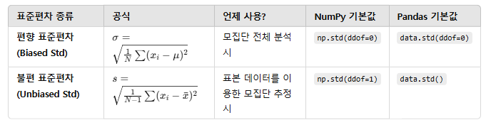 - ddof=0이면 모집단 표준편차(편향), ddof=1이면 표본 표준편차(불편).
