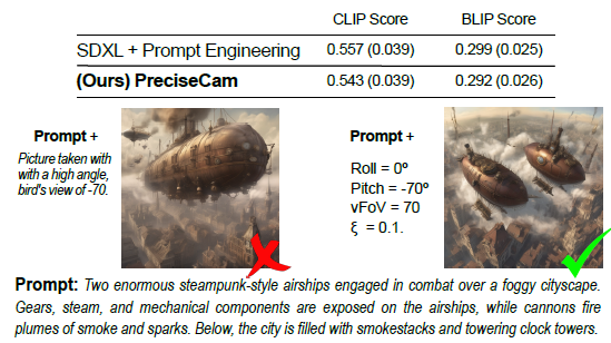 이번 CVPR 2025에서 발표된 논문 **"PreciseCam: Precise Camera Control for Text-to-Image Generation"**은 이 문제를 해결하기 위해 제안된 프레임워크입니다.