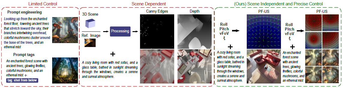 이 네 가지 파라미터를 **PF-US (Perspective Field – Unified Spherical)**라는 표현 방식으로 변환하여, 각 픽셀이 카메라 파라미터에 따라 어떻게 보이는지를 per-pixel로 인코딩합니다. 이 표현은 ControlNet을 통해 Stable Diffusion XL(SDXL)에 주입되어, 프롬프트와 카메라 제어를 명확히 분리한 이미지 생성을 가능하게 합니다.