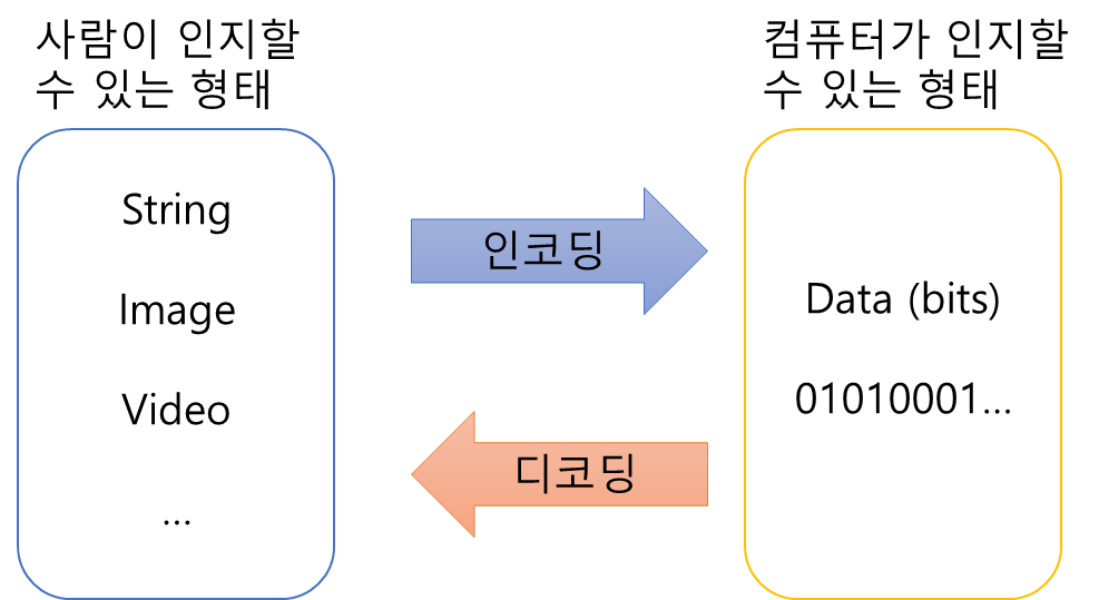 인코딩과 디코딩 여기서 사람을 위한 데이터와 컴퓨터를 위한 데이터(숫자) 사이의 매칭을 약속해두고, 어떤 규약을 사용하였는지 명시해야한다.