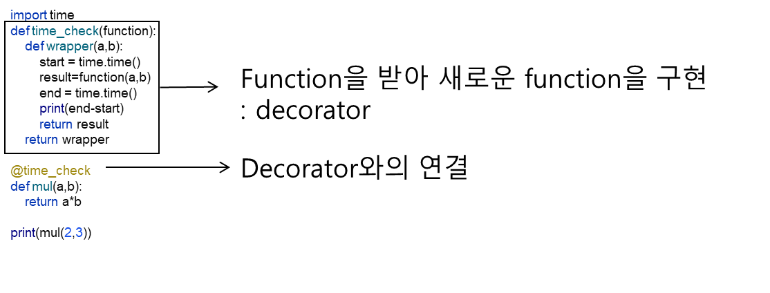 이를 다른 함수에서 @time_check와 같이 위에 연결해주면 해당 함수는 decorator의 형태로 동작하게 된다.