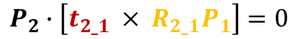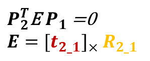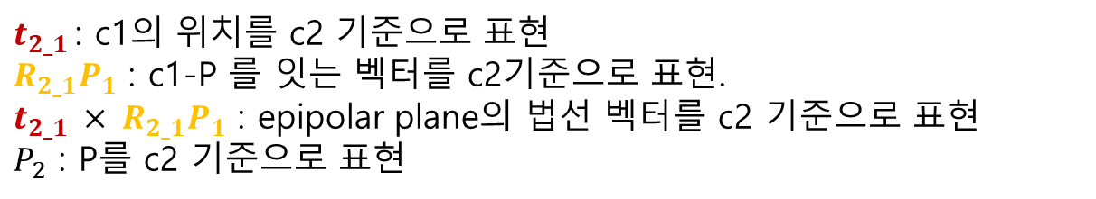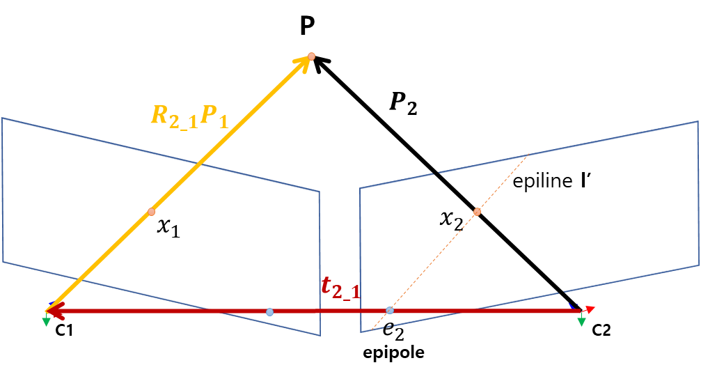 C2 좌표계를 기준으로 P1 / T2_1 / P2의 관계를 표현한 것이 epipolar constraint이다.