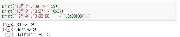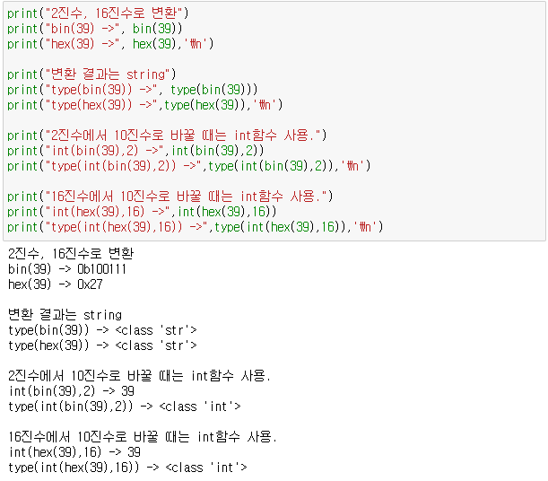 반대로, 10진수로 돌아올 때는 int 함수를 사용한다. (함수의 두번째 인자로, input의 기수를 쓴다.)