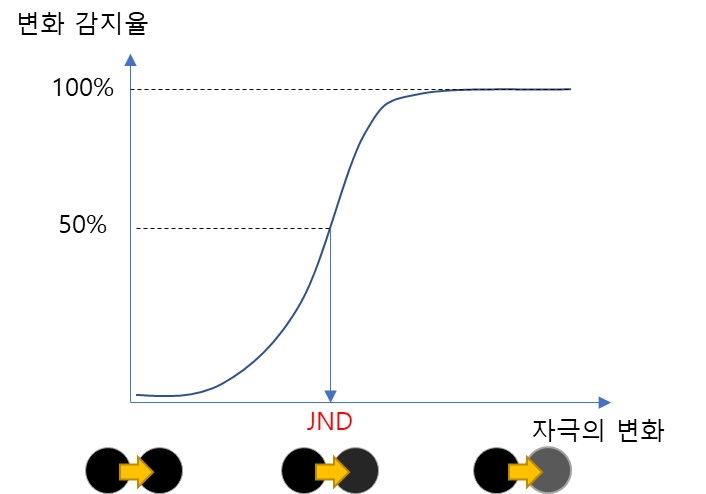 JND 아래의 두 원은 밝기가 미미하게 다르다. 어떨때보면 같은 밝기로 보이고, 어떨때보면 다른 밝기로 보일텐데, 한 50%쯤이지 않을까? JND는, 기존자극의 크기와 비례하다.