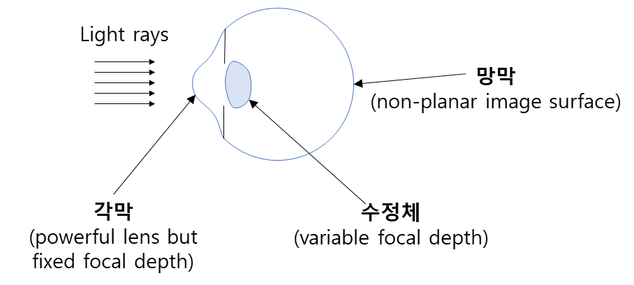 눈의 각 부분 중, 광 경로에 영향을 주는 부분만 표현. 렌즈 역할을 하는 두 부분은 각막과 수정체이다. 큰 굴절은 각막에서 이루어지며, 추가적인 굴절이 수정체에서 가변적으로 이루어진다. 3. Accommodation (조절)