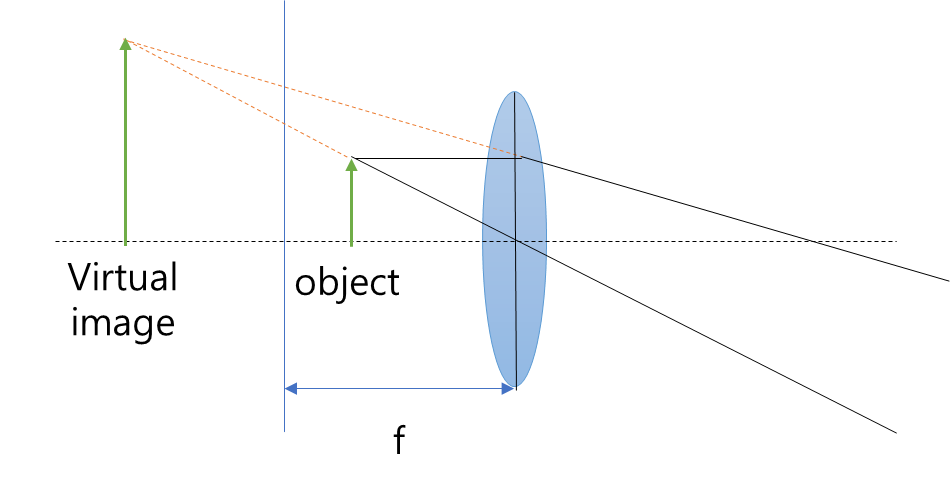 렌즈의 초점거리 이내에 screen을 배치시키면, 먼 거리에 실상이 생성되게 되고, 사용자가 충분이 납득할만한 거리에 상을 맺히게 할 수 있다.