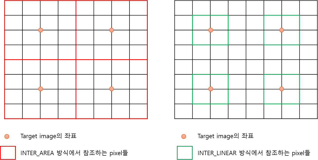 왼쪽은 INTER_AREA 방식의 pixel 참조, 오른쪽은 INTER_LINEAR 방식의 pixel 참조이다. 위와 같이 최종 image가 1/4크기로 resize될 때, INTER_AREA방식은 주변 16 pixel의 평균을 취하지만, INTER_LINEAR방식은 주변 4 pixel만 참조하게 된다. INTER_LINEAR 방식의 경우 정보가 버려지는 픽셀들이 발생하게 된다.